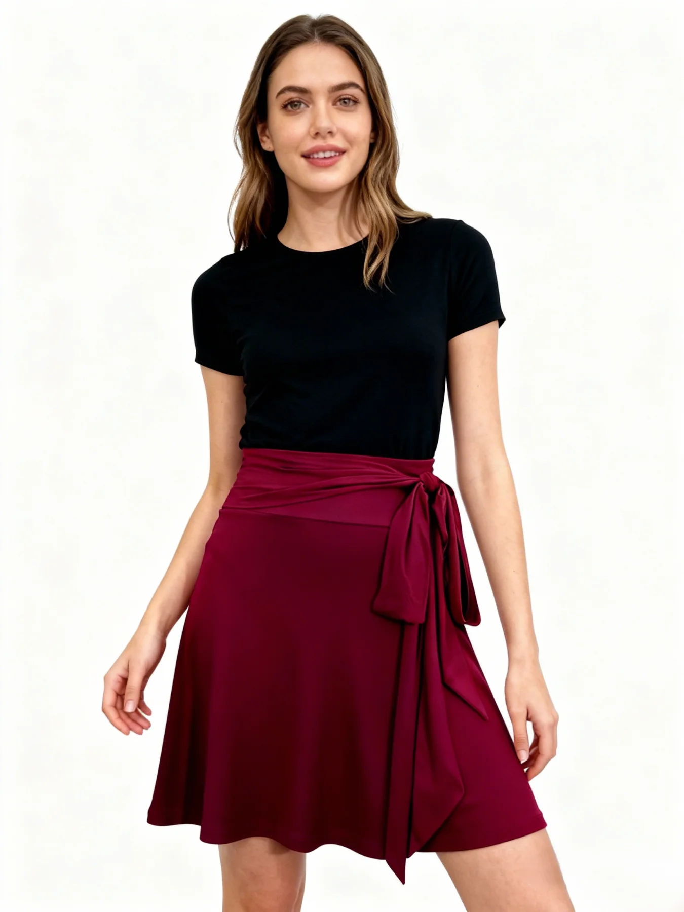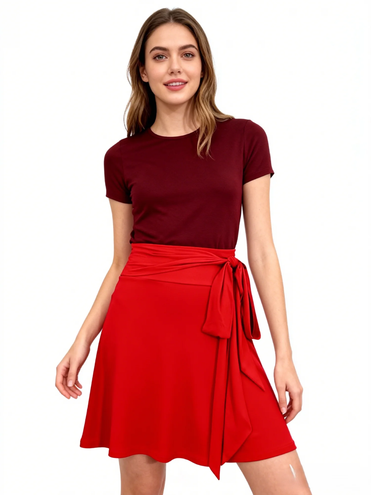 Women's Summer Knitted Soft Stretch High Quality Elegant A-Line Stylish Wrap Midi Skirt with Self - Tie Belt & Flared Hem